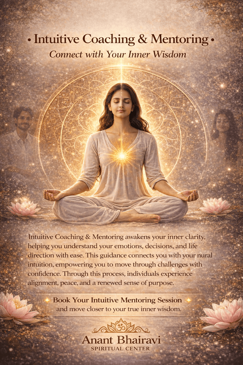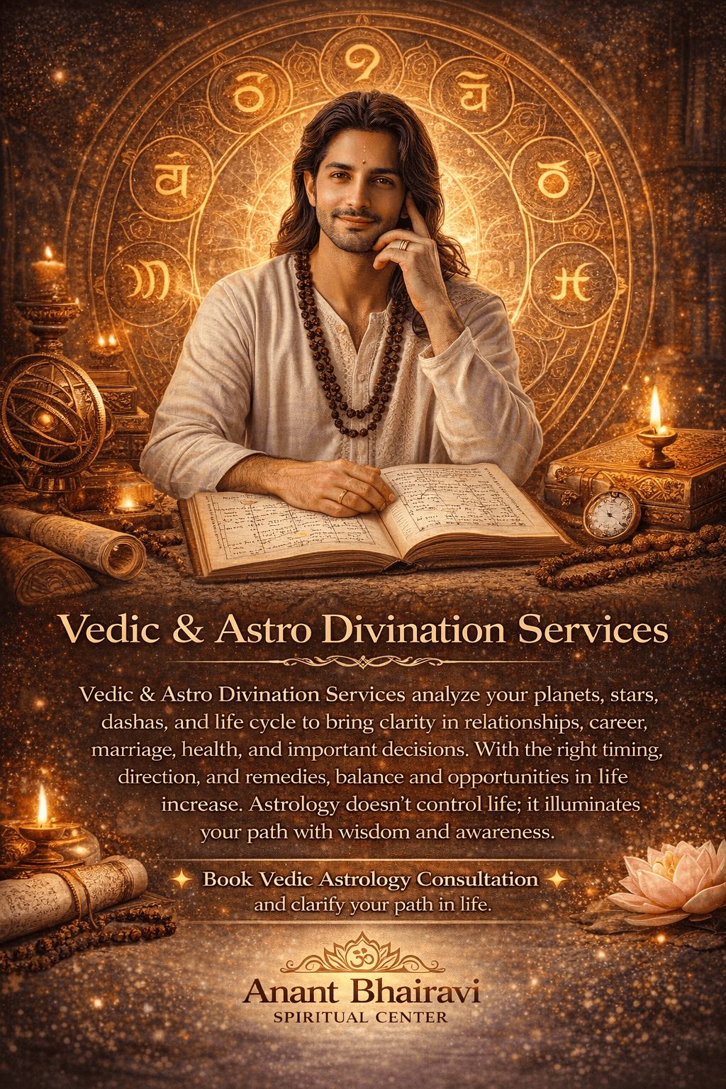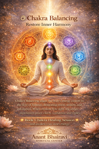 ANANT BHAIRAVI SPIRITUAL CENTER में साधक के लिए आत्मविद्या एवं अध्यात्म मार्ग का द्वार उद्घाटित किया जाता है। यहाँ ज्योतिष, वास्तु, मंत्र-चिकित्सा, ऊर्जा-शुद्धि, चक्र-संतुलन, कर्म-निवारण तथा दैवी मार्गदर्शन द्वारा जीवन में शांति, सौभाग्य एवं समन्वय की स्थापना की जाती है।